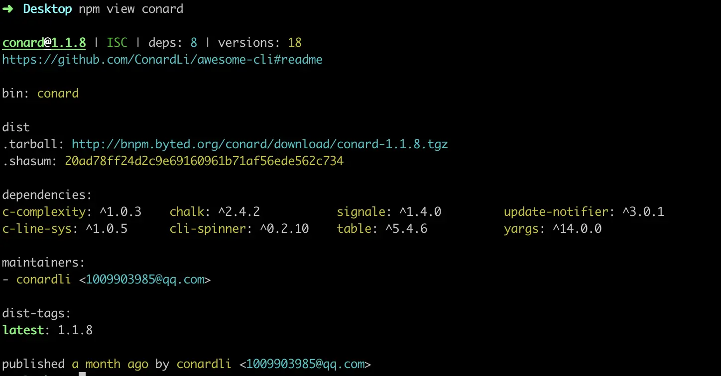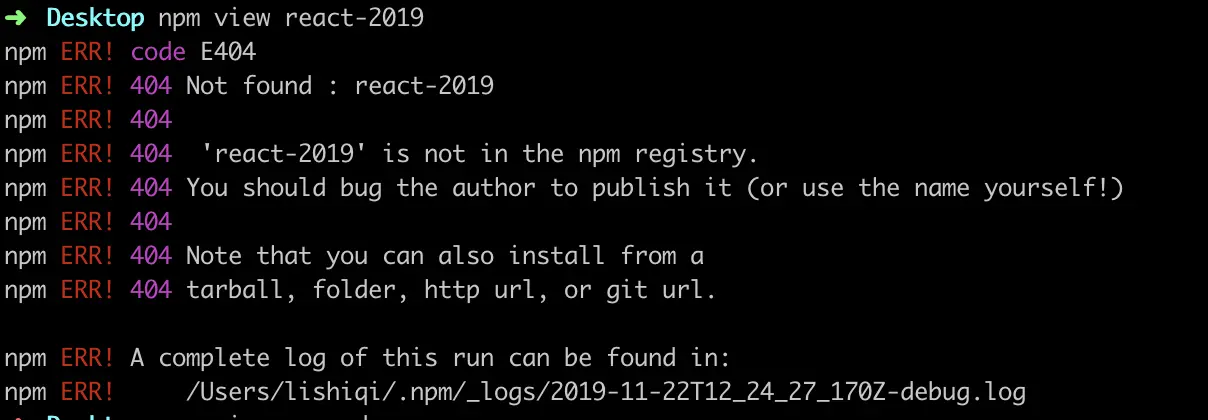 name 是一个包的唯一标识,不得和其他包名重复,我们可以执行 npm view packageName 查看包是否被占用,并可以查看它的一些基本信息: