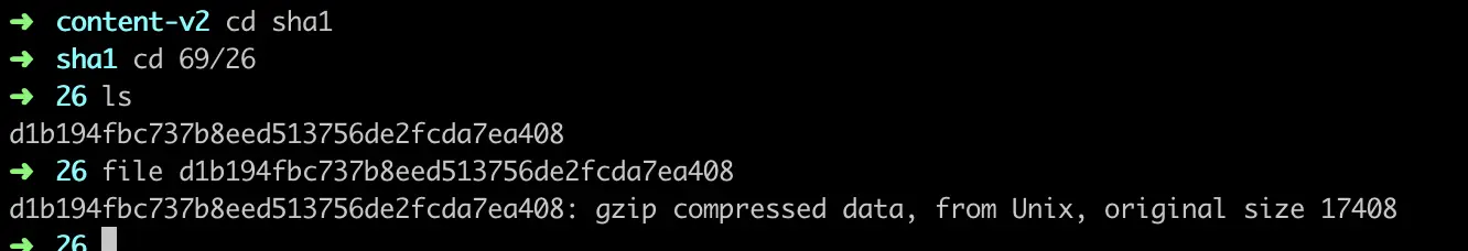 上面的 _shasum 属性 6926d1b194fbc737b8eed513756de2fcda7ea408 即为 tar 包的 hash, hash的前几位 6926 即为缓存的前两层目录,我们进去这个目录果然找到的压缩后的依赖包: