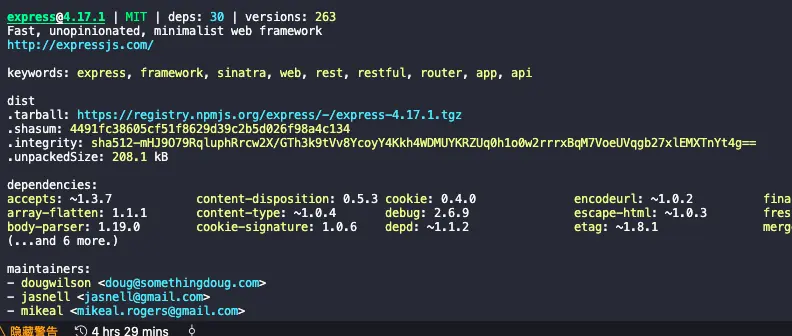 在下载依赖包之前,我们一般就能拿到 npm 对该依赖包计算的 hash 值,例如我们执行 npm info 命令,紧跟 tarball(下载链接) 的就是 shasum(hash) :