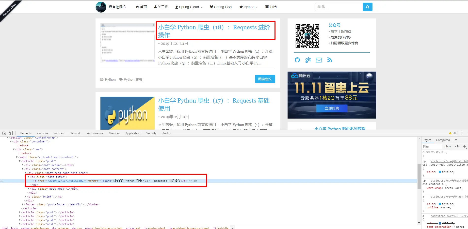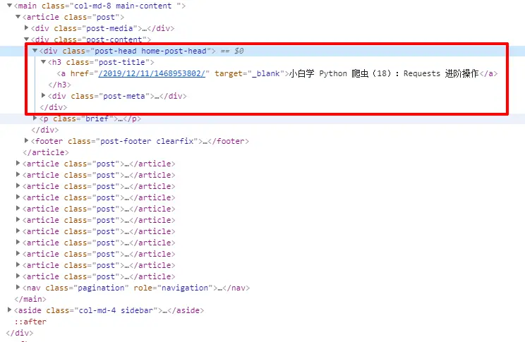 我们还是文章的题目为例,我们先获取所有的文章题目,再进行选择,示例代码如下:
