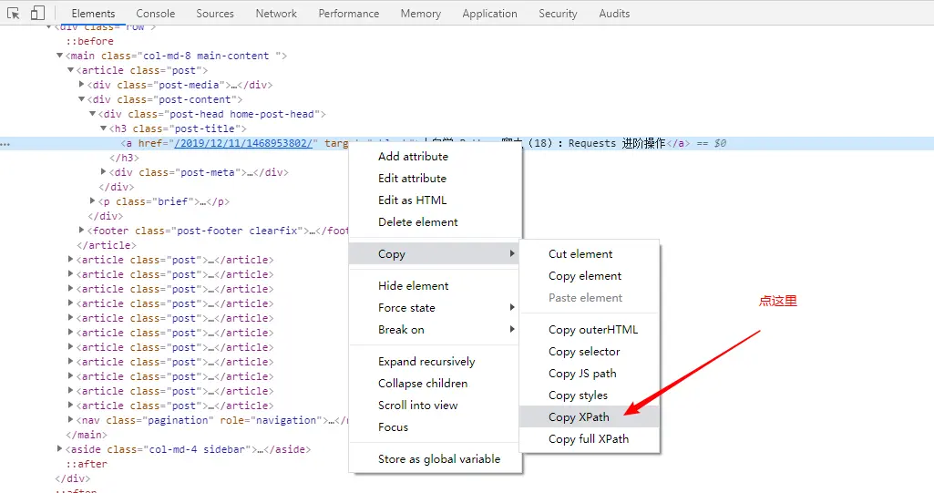 第二次,我们选择了当前页面第一篇文章的题目,这里注意下,中括号中传入数字1即可,这里的开始是以 1 为第一个的,不是程序中的 0 为第一个。