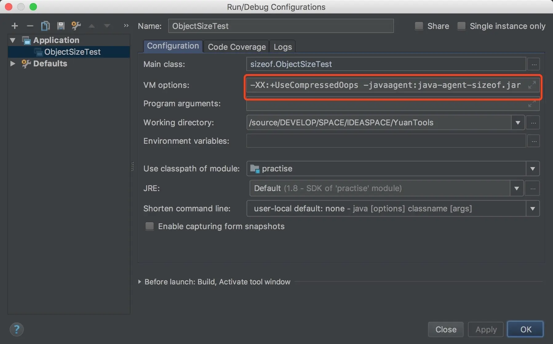 为了方便,我们在 IDEA 中验证一下,导入刚才的 ObjectSizeTest 类,指定 JVM 参数如图