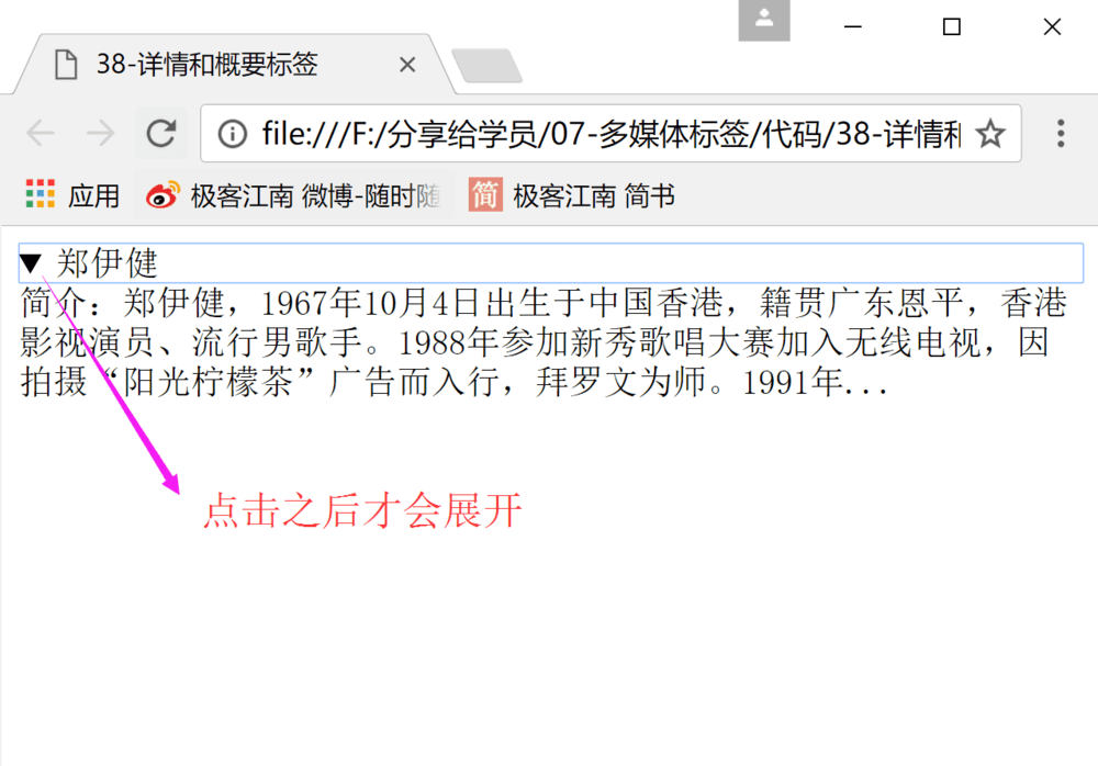 作用 : 利用summary标签来描述概要信息, 利用details标签来描述详情信息。默认情况下是折叠展示, 想看见详情必须点击格式 :