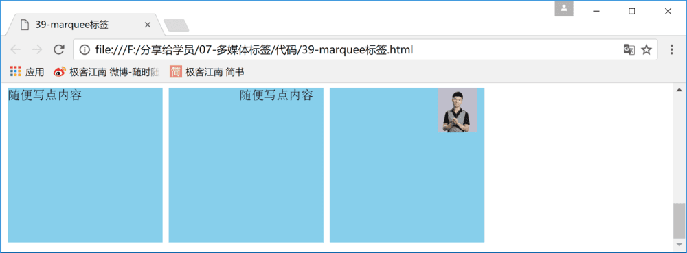 注意点 : marquee 标签不是 W3C 推荐的标签 , 在 W3C 官方文档中也无法查询这个标签 , 但是各大浏览器对这个标签的支持非常好