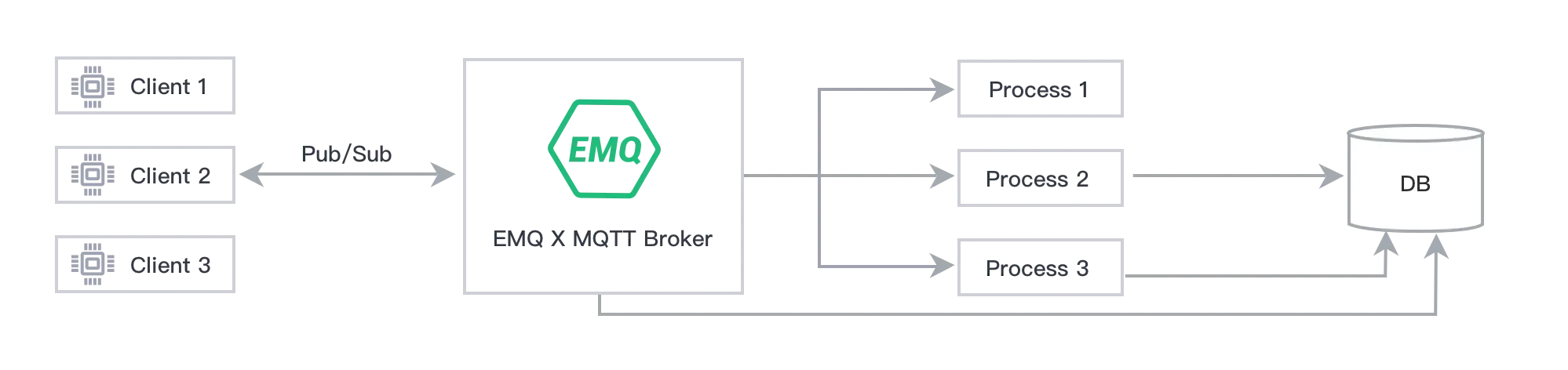 该原型中需要在 EMQ X 上维护多个数据通道,以供每个业务环节按照各自需求从 EMQ X 中获取消息数据。这种解决方案的问题在于: