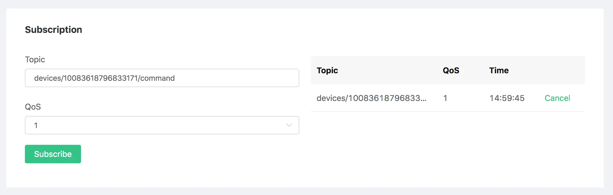 根据业务需求,需订阅门锁专属下行控制主题 devices/{client_id}/command,此处需订阅 devices/10083618796833171/command 主题并设置 QoS = 1: