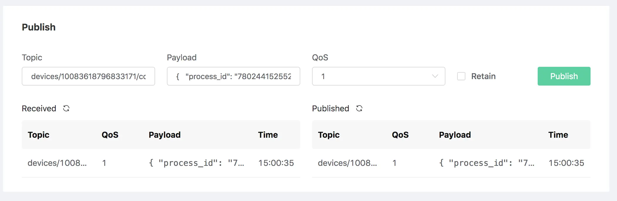 该条消息包含了 MQTT 接收/发布客户端信息与 Base64 编码后的 Payload 数据: