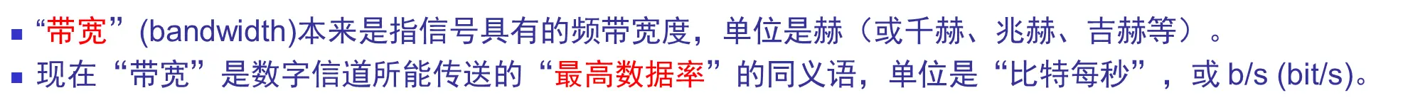 | 带宽 | 单位时间内信道能通过的 "最高数据率" |