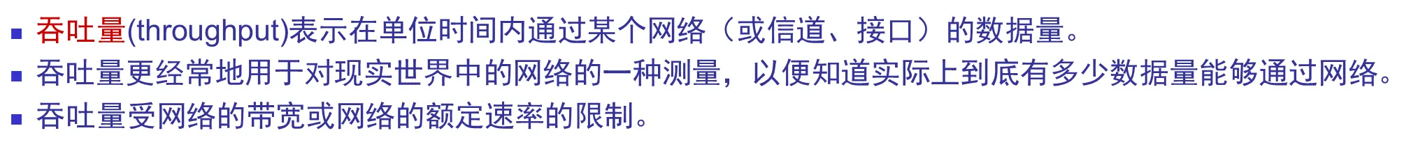 | 吞吐量 | 单位时间内通过某网络(信道或者接口)的实际数据量 |