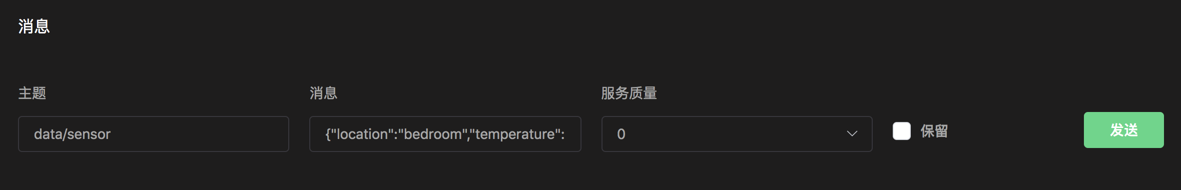 切换到 工具 --> Websocket 页面,使用任意信息客户端连接到 EMQ X,连接成功后在 消息 卡片中发送如下消息: