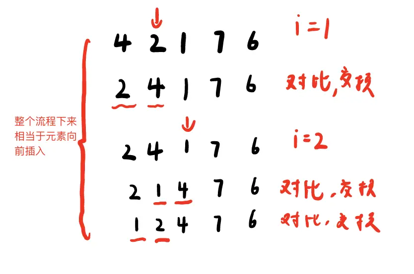 插入排序的思想也非常简单,即是向后遍历( i ),每次遍历的向前内循环中( j ),将a[ i ]插入到a[ i - 1],a[ i - 2],a[ i - 3 ]...中相应的位置。在这个过程之中,a[ i - 1],a[ i - 2],a[ i - 3 ]...向后挪动,a[ i ]向前。
