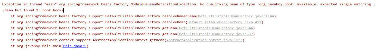 此时,如果通过 Class 去查找 Bean,会报如下错误: