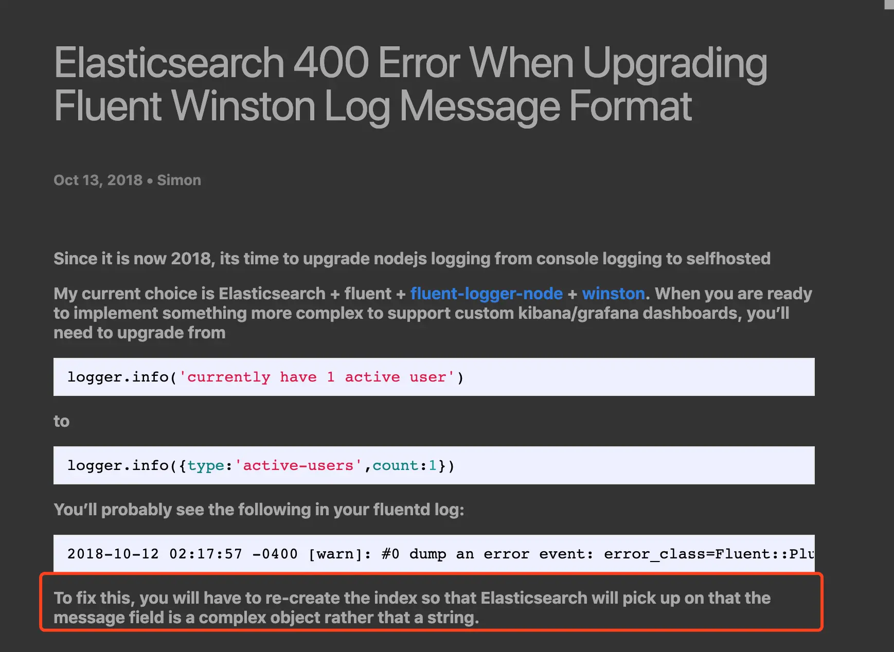 - Elasticsearch 400 Error When Upgrading Fluent Winston Log Message Format, ramsay.xyz/2018/10/13/…