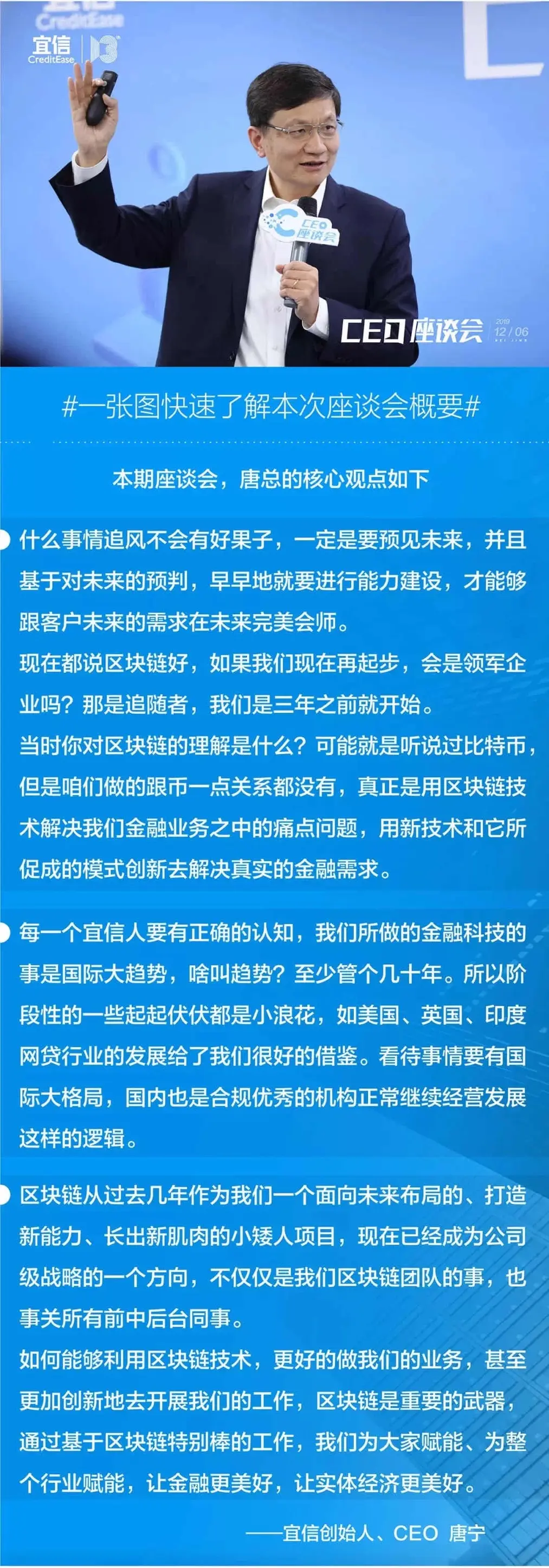 12月6日下午,每月一次的CEO座谈会在北京如期举办,近百位同事到场参加。本期座谈会邀请了宜信首席技术官向江旭、宜信区块链实验室主任、翼启云服区块链业务总监于明扬、宜信金融科技产业基金合伙人秦琴等三位嘉宾,与唐宁一起就同事们关心的问题共话宜信的区块链实践。