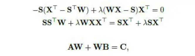 而至此,假设A=SST, B=λXXT,C=(1+λ)SXT, 公式可以转化Sylvester 公式,利用现有数学算法是可以直接计算矩阵的。如此求解出参数W,模型自然就可以用于推理匹配。