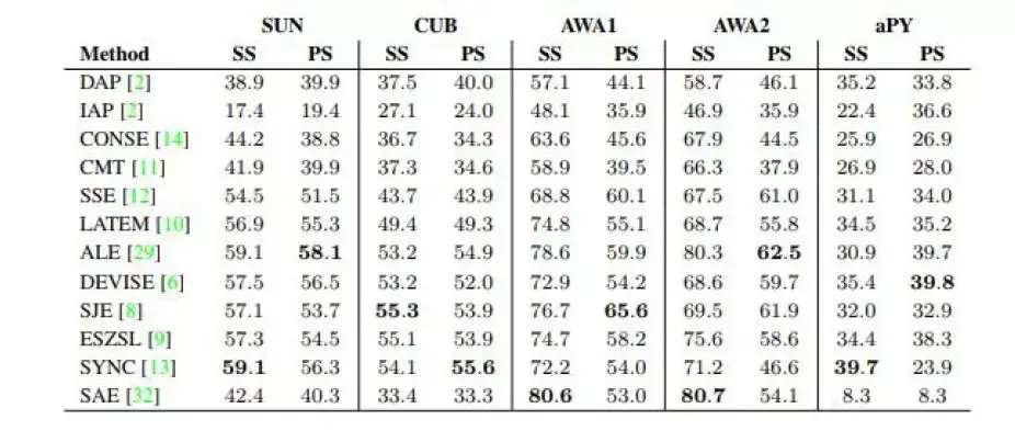 对SUN、CUB、AWA1、AWA2、aPY 表示5 个标准数据集进行测试,2017 年以后普通ZSL 的SOTA 模型在部分数据集上表现已经不错。