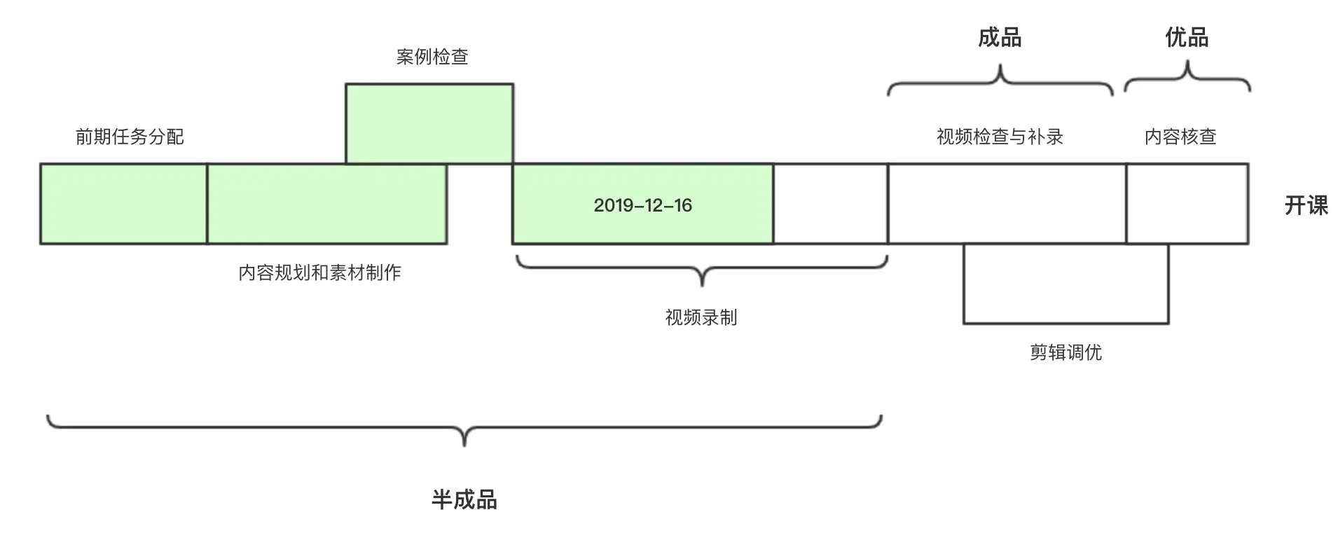 开课时间是大家最关注的问题,课程宣传中我们给出的最迟开课时间是 2020-01-20,按照当前进度来看并不会那么晚。下图是系列课制作的内容项和时间轴: