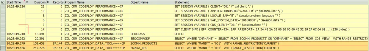 And use ST05 to trace the duration of these two kinds of SELECT SQL. The case for direct read via SELECT SQL: 0.159 second The case for CDS redirect: 0.247 second