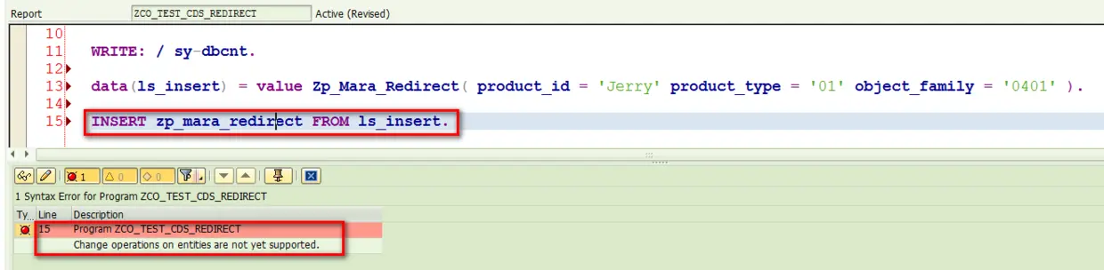 I have a CDS view Zp_Mara_Redirect and its corresponding database view is zmara_cds. When I try to insert some entry to CDS view, I get following error message:
