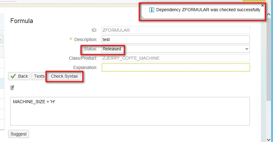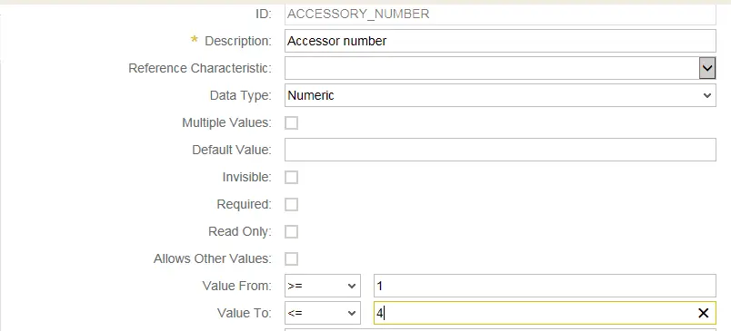 We can maintain formula for example below. In this case, it means "if the characteristic MACHINE_SIZE is selected as H(Home), another characteristic ACCESSORY_NUMBER would automatically be determined as 2".