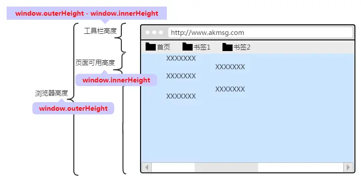 浏览器窗口高度,如果存在水平滚动条,则包括滚动条 | 只读属性,没有默认值,不支持的浏览器则是undefined |