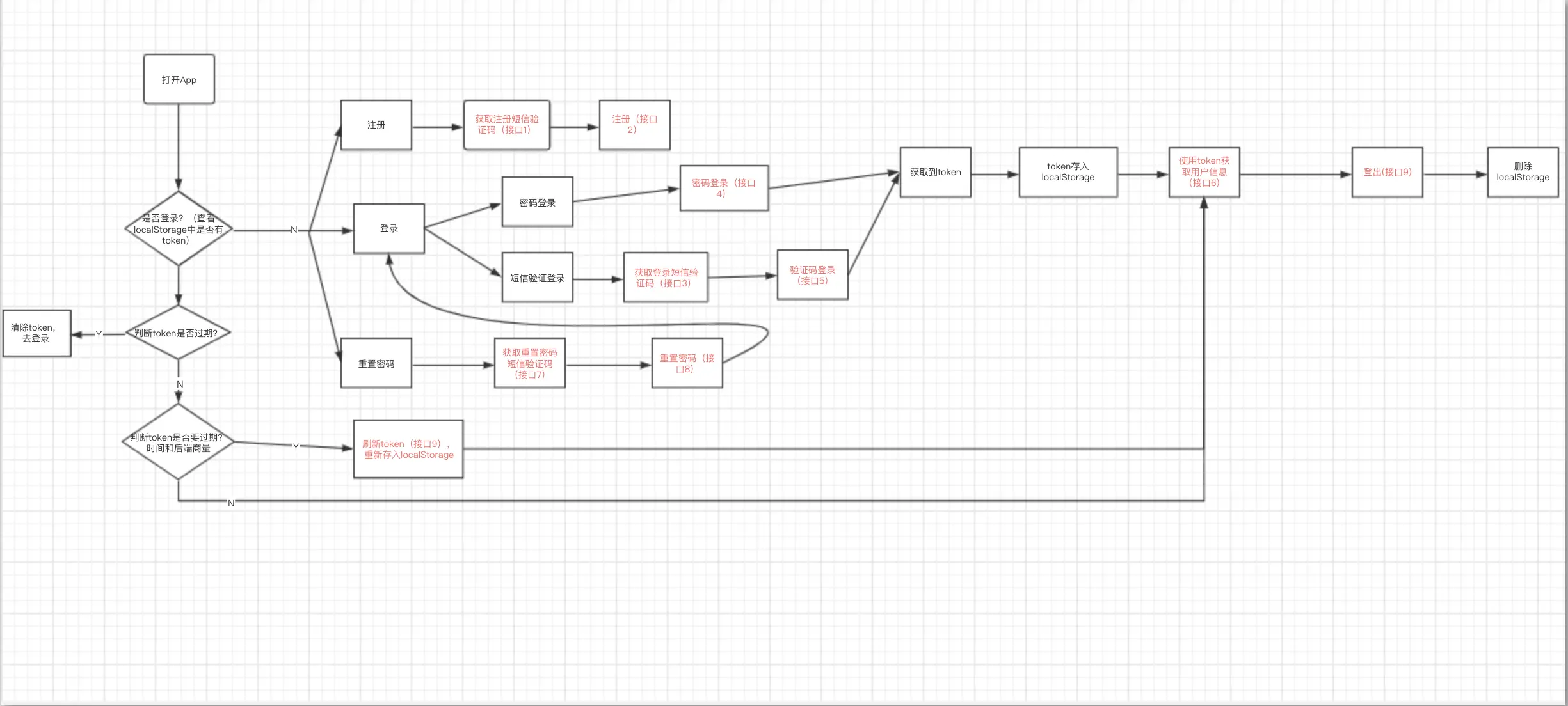 【原创】商业项目用户登录注册流程 xishanxu 2019-12-17 318 阅读1分钟 登录注册的流程有很多种,这是某公司的登录注册流程,为了方便理解 使用 processon 画了一个流程图,地址 www.processon.com/view/link/5… 一共用了10个接口 这个是不包含权限管理的,权限管理是第六个接口,使用token获取到用户信息了,然后通过用户信息中包含的职位做的