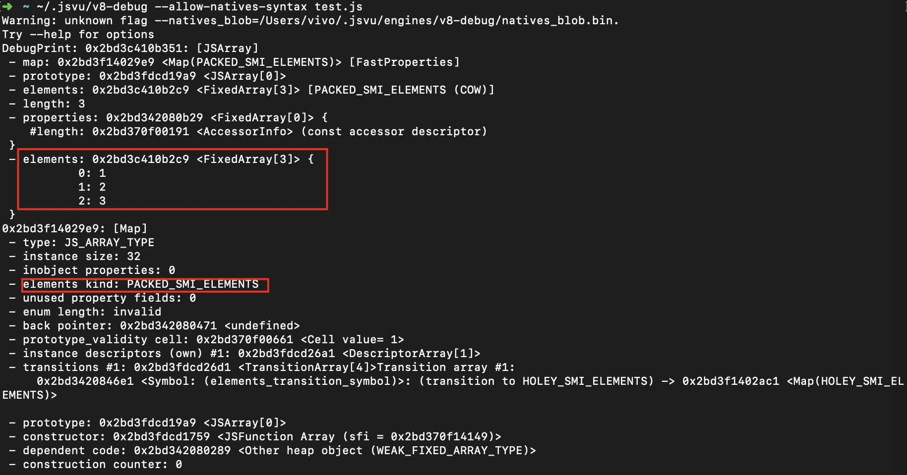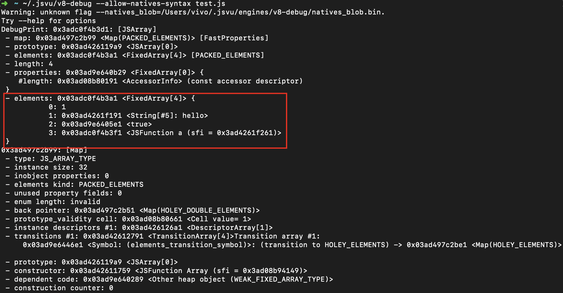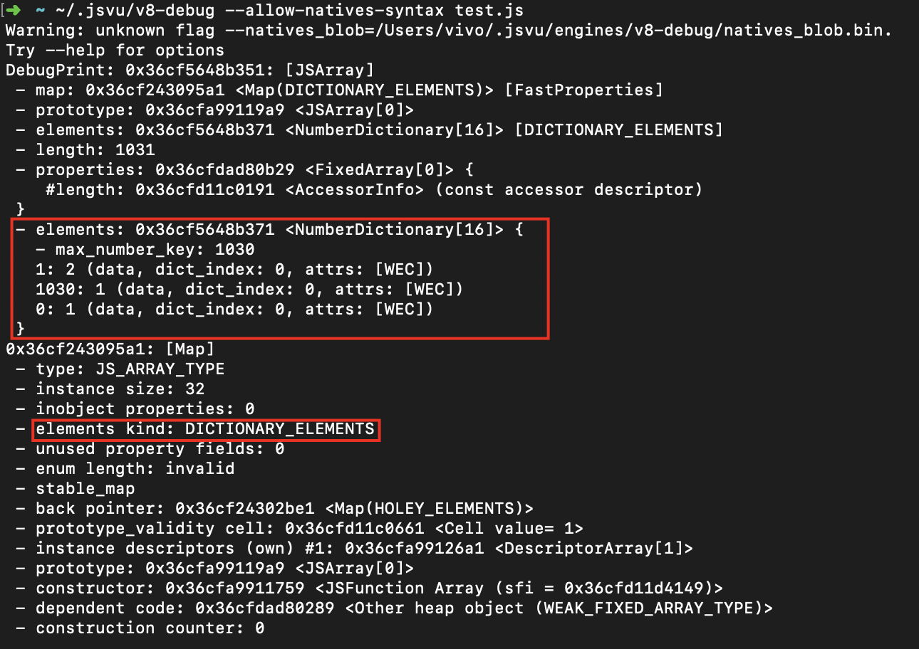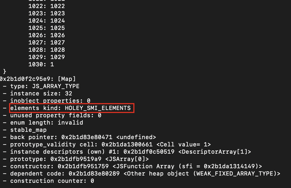 可以看到,数组变成了快数组的 Fast Holey Elements 模式,验证成功。