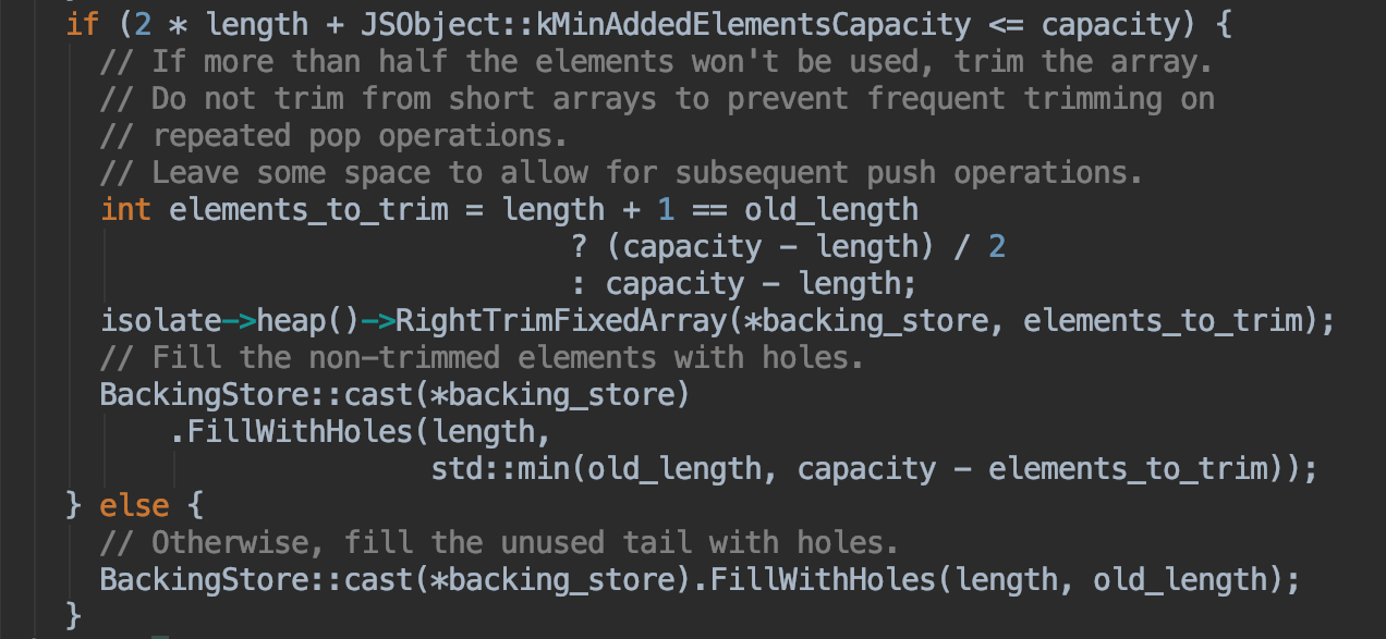 如果容量 >= length的2倍 + 16,则进行收缩容量调整,否则用holes对象(什么是holes对象?下面来解释)填充未被初始化的位置。