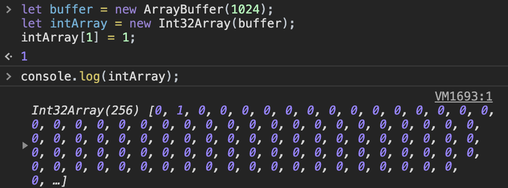 let intArray = new Int32Array(bf);这行代码创建了有符号的32位的整数数组,每个数占 4 字节,长度也就是 1024 / 4 = 256 个。