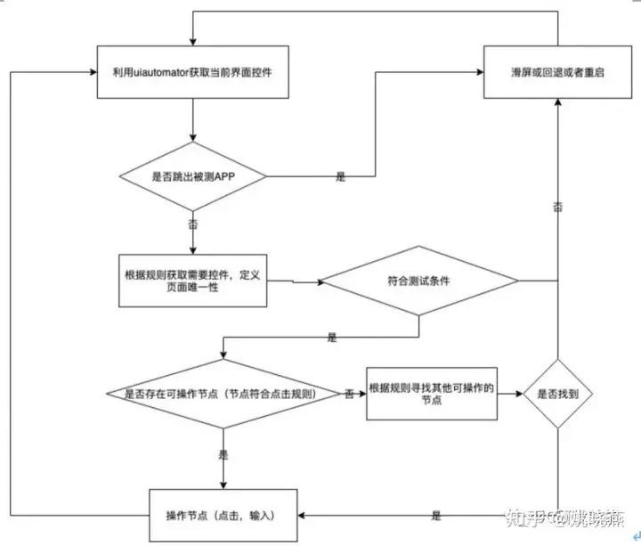 智能遍历测试流程整体上是遵循业界比较流行的方式通过Uiautomator获取当前页面的控件进行智能分析,提取分析出可遍历操作的控件。这样的好处是不言而喻的,对比原生monkey,避免了大量的无效点击,大大提高了单位时间内对App控件操作的覆盖率,提升测试效率。