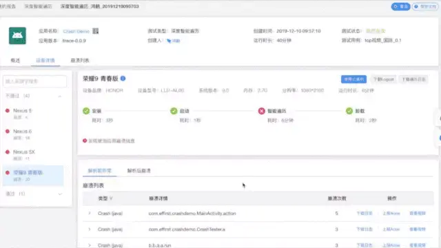 另一个评估效果的方式,是对每次操作和点击位置的截图以及对界面控件信息的记录。但这对于在手机端执行的“智能遍历”来说数据量比较大,特别是很多时候都是运行几个小时,产生过几千次的点击在手机端保存这些信息不会太合适。不过岩鼠提供了实时的崩溃分析并进行崩溃点的录像。可以满足一定的崩溃定位需求,这个可以通过岩鼠测试报告进行查看。