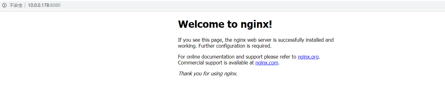docker run --name nginx-test -p 8080:80 -d nginx运行完后看10.0.0.178:8080能访问说明ok