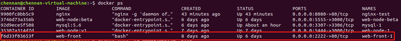 docker run -itd --name web-front-1 -p 2222:80 web-front:latest bashdocker ps 查看容器web-front-1