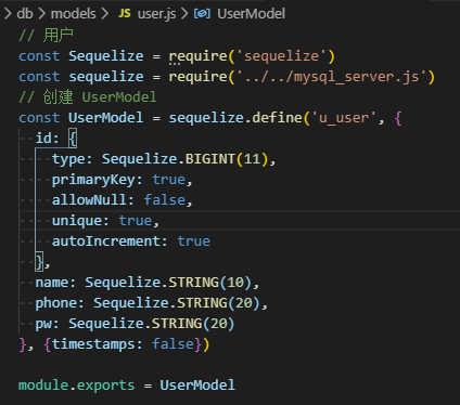 ps:数据库里你得预先建张表u_users(sequelize建模时会自动找这张表,没有使用sync来强制建表)