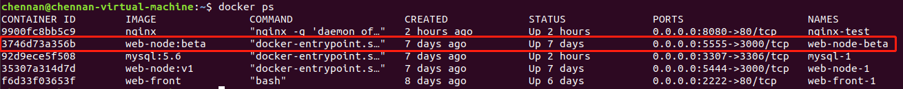 docker run -itd --name web-node-beta -p 5555:3000 web-node:beta bashdocker ps 查看容器web-node-beta