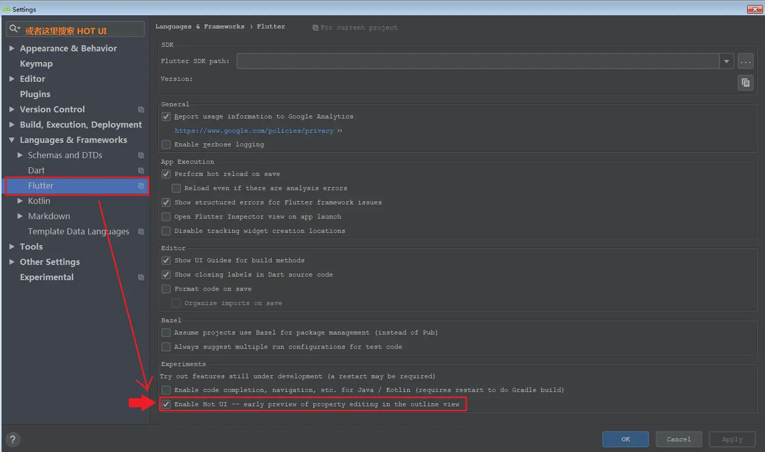 你可以在Flutter的IntelliJ / Android Studio插件中找到这个新功能,目前还是预览版。然后你可以在构建组件时可以直接在IDE中查看它们并与之交互,点击菜单File -> Settings-> Languages & Frameworks(或者打开设置页面之后,直接搜索HOT UI),然后找到Flutter,然后勾选“HOT UI”,具体操作如下图所示: