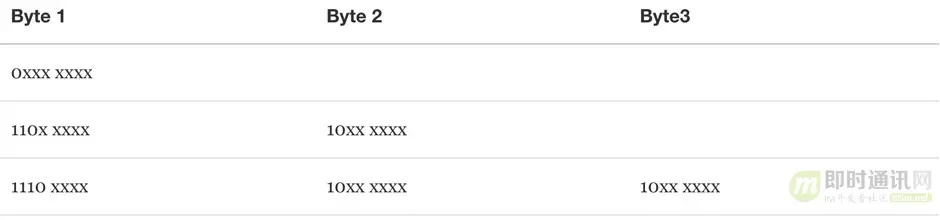 我们分别看三个从一个字节到三个字节的UTF-8编码例子: