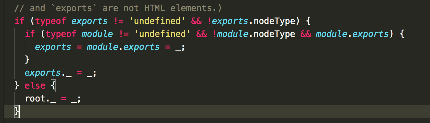 一个库最后总是要暴露出来使用的,在没有模块化的年代我们直接使用window._ = _就可以完成了,为了支持模块化,underscore做了很多判断操作,如下