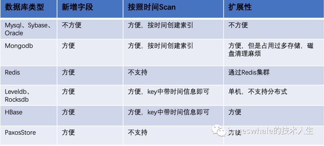 存储系统的考量维度 内容推荐有时效性限制,一般来说,图文是3天,图集1个月,视频3个月。对于超过3天的图文,即使处理了也进入不了推荐池,所以能根据时间区间检索文章是一个很高频、很急迫的场景。 下面是业界常用的一些数据库,从几个方面进行了比较,我们最终选定HBase作为信息流内容的存储。HBase既可为在线服务提供实时KV读写(若数据都在内存,4核8GB内存云服务器,可提供>= 1万的QPS),也可为离线任务提供批量Scan条件查询。