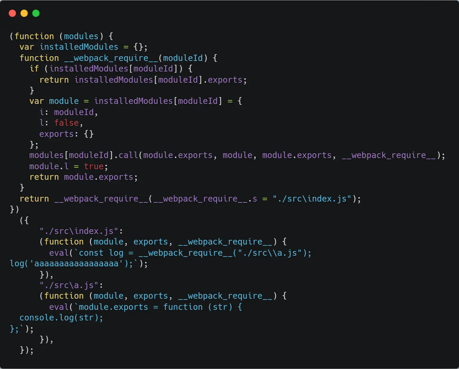 然后执行我们的命令,打开 bundle.js 文件可以看到: