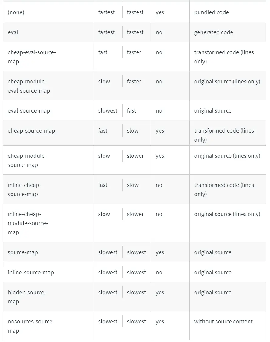 devtool的开发工具配置,这个选项就是我们说的开发调试的时候用的,之前我也一直没用弄清楚到底是什么用的,也是查找过资料才明白,其实就是当我们启用 webpack 的时候,所有的代码会被处理,压缩等等,这样如果有什么报错信息的话,我们则无法查找到具体的错误代码的位置,因此webpack给我们提供了这个选项,让我们来配置打包后的代码如何调试。有这么几个配置选项: