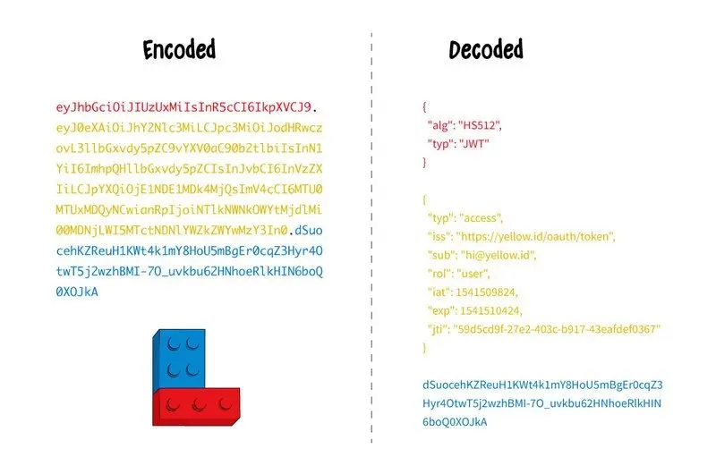工作原理:当用户第一次使用用户名和密码登录系统时,系统不仅会返回一个访问令牌(只是一个字符串),而是一个包含所有用户信息的 JSON 对象,比如角色和权限,使用 Base64 进行编码并使用私钥签名。下图是它在没有编码的情况下的样子: