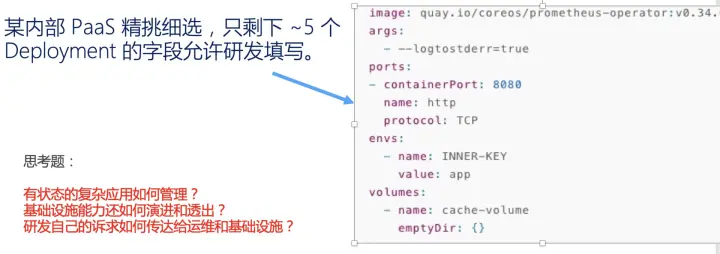 归根结底就是屏蔽大量字段的方式会限制基础设施本身的能力演进,但是 K8s 的能力是非常强大而灵活的。我们不可能为了简化而放弃掉 K8s 强大的能力。