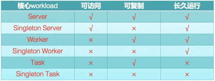 主要通过是否可访问、是否可复制、是否长久运行来区分。如 Server,就代表了大家最常用的 K8s 里面 Deployment+Service 的组合。