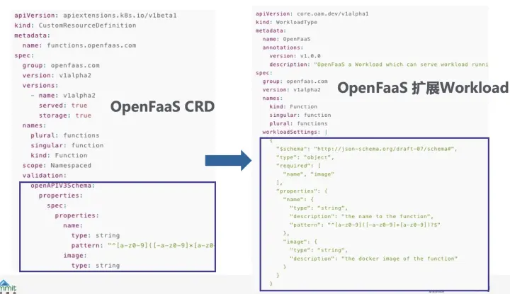 而针对复杂的有状态应用,OAM 则允许通过扩展 Workload 来实现,如下图所示,我们可以定义一个新的叫 openfaas 的 WorkloadType,它的定义实际上完全等价于一个 CRD 定义。