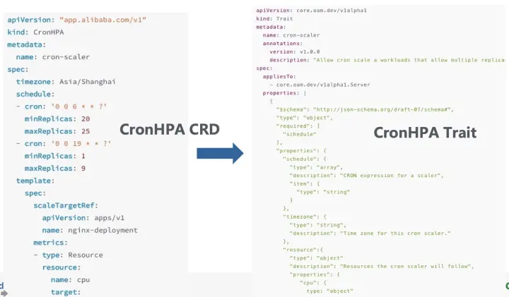 }可以看到,他可以在 Trait 定义里清晰的看到这个运维能力可以作用于哪种类型的 Workload,包括能填哪些参数、哪些必填/选填、参数的作用描述是什么。 你也可以发现,OAM 体系里面,Component 和 Trait 这些 API 都是 Schema,所以它们是整个对象的字段全集,也是了解这个对象描述的能力“到底能干吗?”的最佳途径。
