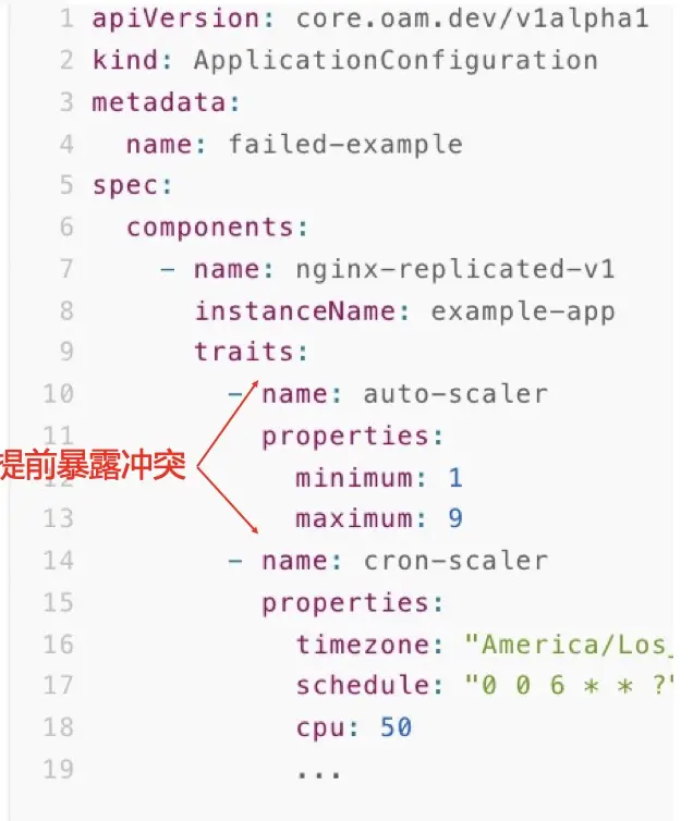 而我们图中的 Rudr 项目就是 OAM 的一个实现,也可以理解为 OAM 的一个解释器,将 OAM 的统一描述转换为背后众多的 Operator。同时 Rudr 也是一个统一管理的媒介,如果 Application Configuration 中出现了一个 Component 绑定 2 个 Trait 并且互相冲突的情况,就可以快速被检验并发现问题,如下图所示。