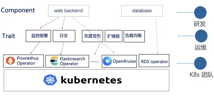 对于研发,通常他关心的应用可能是一个由 web 和数据库组合而成的应用,数据库组件的背后可能是一个 RDS Operator 实现。而 web 应用背后,则可以是我们开源的 K8s 原生 StatefulSet的增强项目 OpenKruise,OpenKruise 中提供的包括原地升级等增强能力则通过 Trait 的方式去配置。而额外的一些监控报警、日志等能力,则由一个个独立的 Operator 去实现,由运维在第二层去关注和管理。