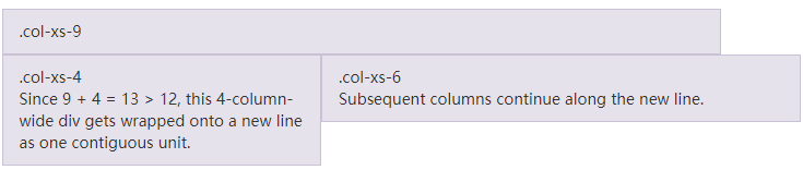 如果在一个 .row 内包含的列(column)大于12个,包含多余列(column)的元素将作为一个整体单元被另起一行排列