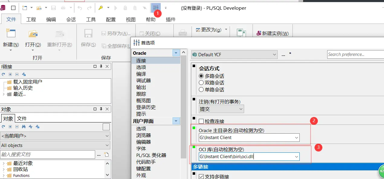 如果没用1号图标,电器旁边那个箭号,点击首选项(英文版是preferences)就会出来了。 2、3是根据你安装的Instant Client目录自己填写的。